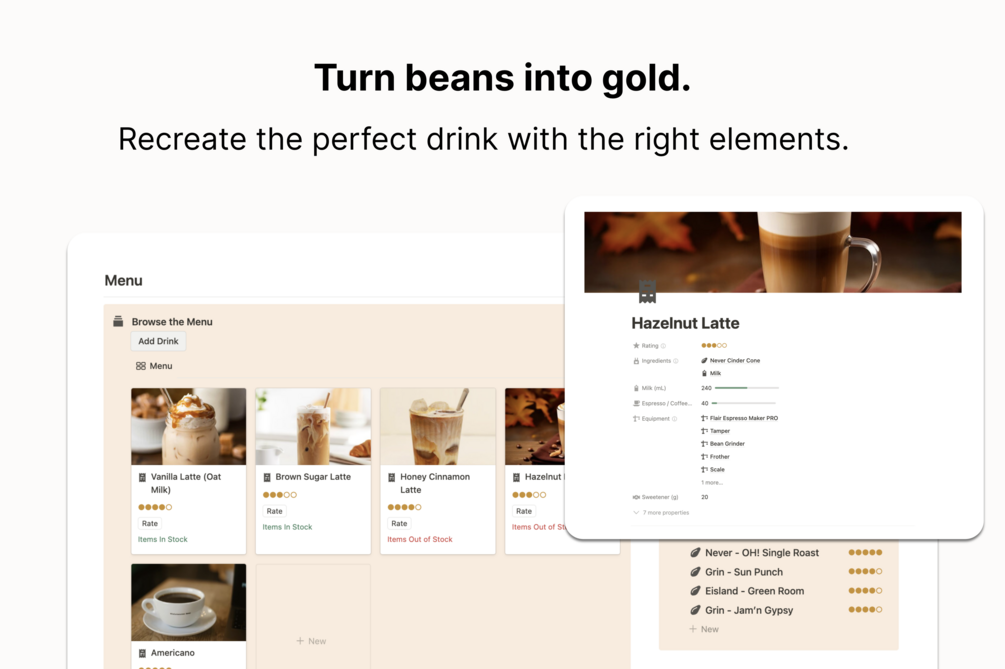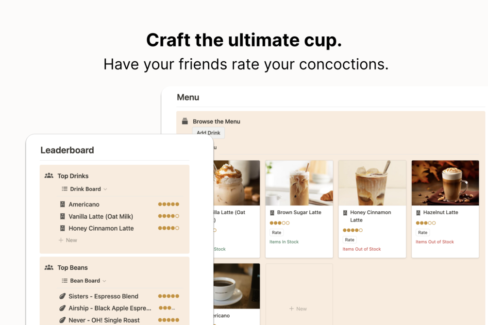 Keep track of your coffee recipes and allow customers/friends to browse and rate drinks directly.