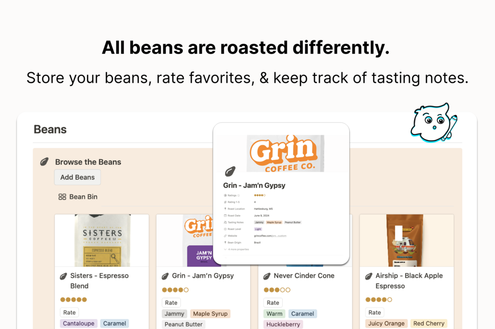 Document your beans' flavor profile, roast type, origin, and rate them.