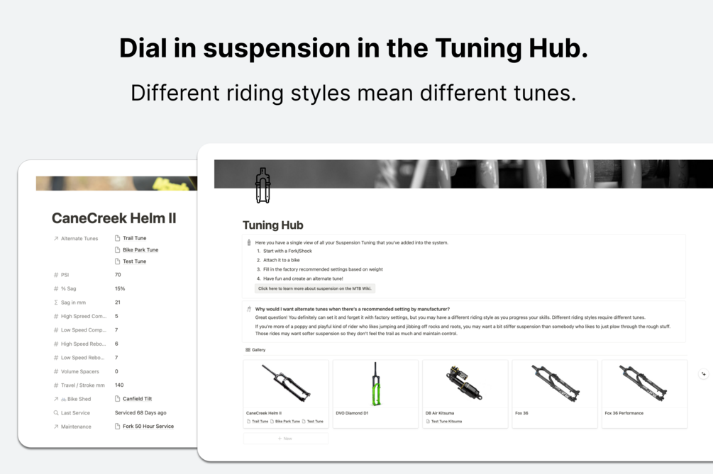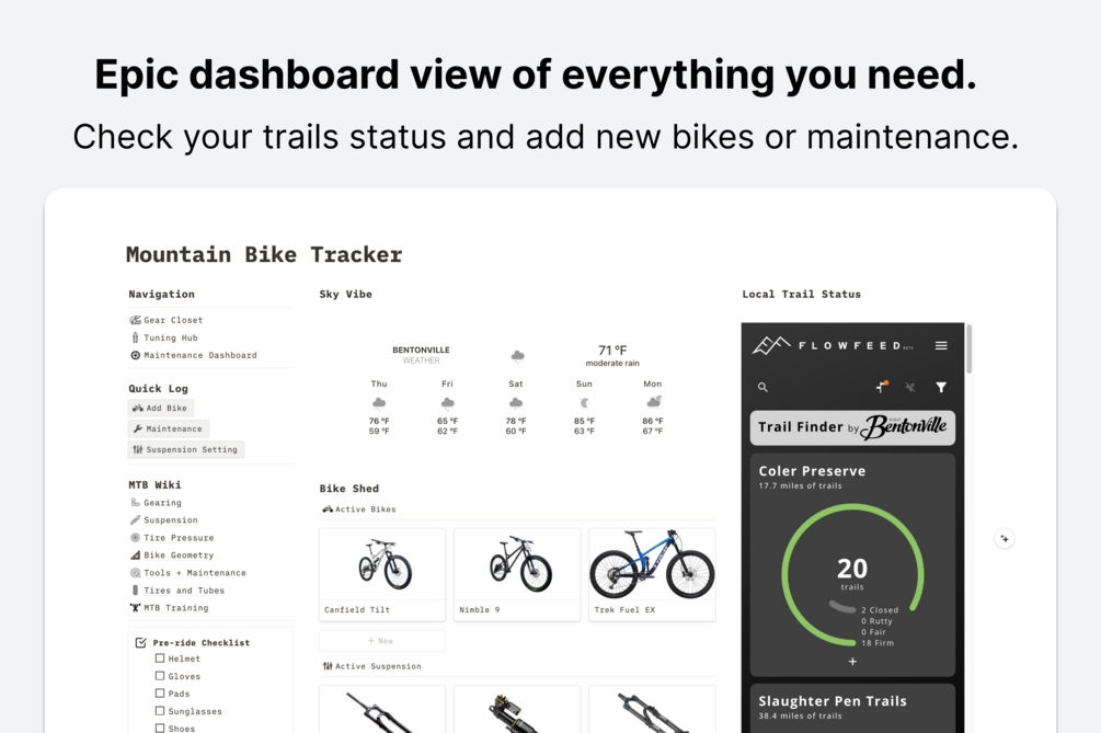 A quick glance of your Bike Shed, Trail + Weather Status, MTB Wiki, Pre-ride Checklist and buttons to quickly log new bikes, maintenance and suspension tunings. -