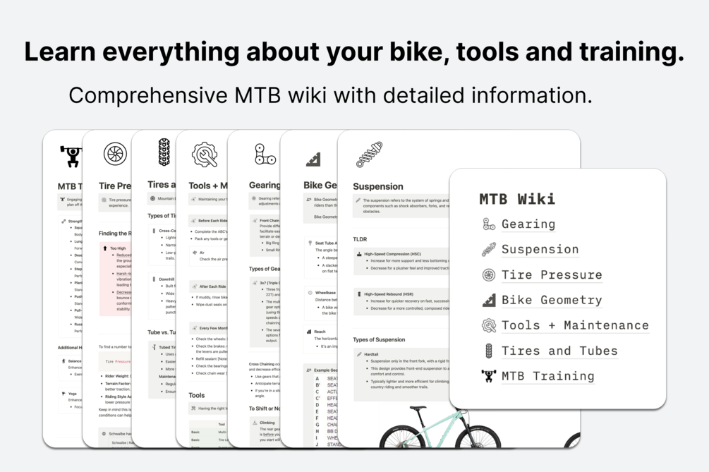 The MTB Tracker is a comprehensive tool and detailed knowledge base to take your mountain biking to the next level!