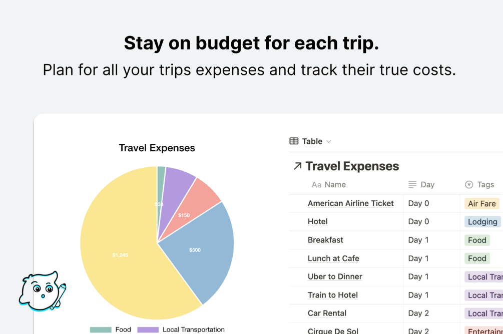 Easily create custom dashboards for each trip with its own itinerary, expense tracker, pack list, journal and more! -