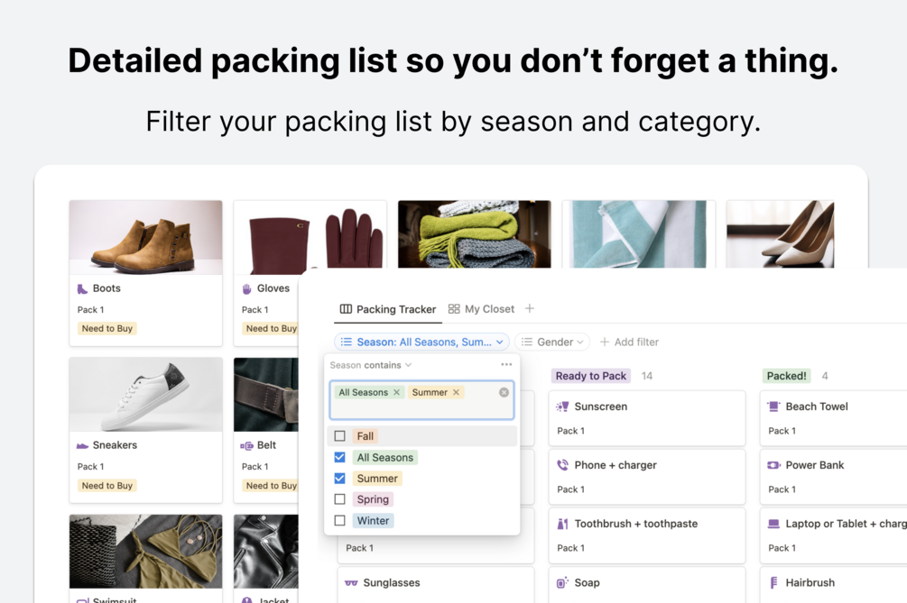 Add to our comprehensive pre-filled list for the ultimate packing list! Filter by season, category and gender to quickly find what you need for anew destination. -